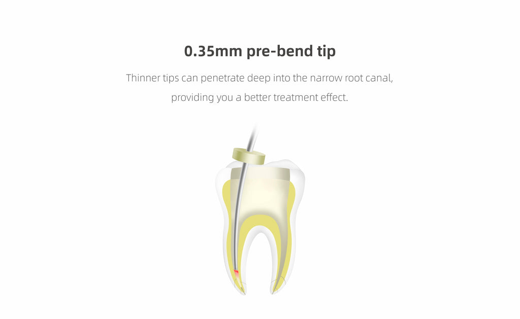 - Slim 0.35 mm Pre-Bent Tip – Penetrates deep into narrow root canals for optimal obturation.