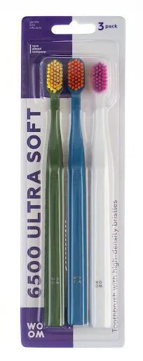 The WOOM ULTRA SOFT 6500 Toothbrush is expertly designed for superior plaque removal with maximum gentleness. Featuring 6500 ultra-soft bristles (0.1 mm diameter), it ensures an exceptionally smooth brushing experience that effectively cleans teeth while protecting enamel and stimulating gums. The ergonomic hexagonal handle provides excellent grip and control, while the cheerful color combinations make brushing fun and stylish.