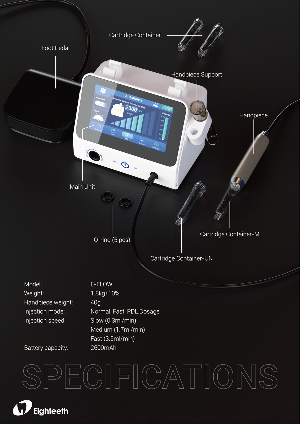 The Eighteeth E-Flow Dental Anesthetic Delivery System is designed to provide painless, precise, and efficient anesthesia delivery, revolutionizing patient comfort in dental procedures. Using patented hydraulic drive technology, E-Flow ensures smooth, controlled injections that minimize discomfort and enhance treatment outcomes.